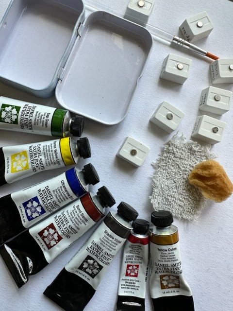 Please note: I use mainly Daniel Smith watercolours and they’ve always worked great for pocket palettes, but some watercolour products are only meant to be used wet, straight from the tube. These may crumble and fall apart when dry, which can make a mess of your palette. I found this out the hard way, but sometimes you just fall in love with a colour. I now add Gum Arabic to certain products, to prevent caking and crumbling. It’s a good idea to do a bit of research in advance, but trial and error works too. 🙂