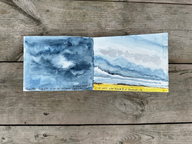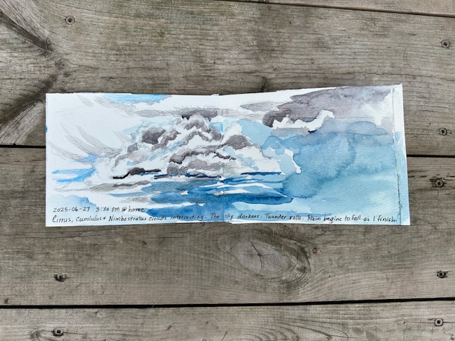 To test these sketchbooks, I’ve decided to fill one with watercolour sketches of clouds and skies. As I often sketch outdoors or in a moving vehicle, I’ve found the size to be travel-friendly, and the size of the small pages is easy enough to fill in a short period of time. I’ve been pleasantly surprised at how well the budget paper I chose is holding up, even when I’ve gone overboard with wet media.
