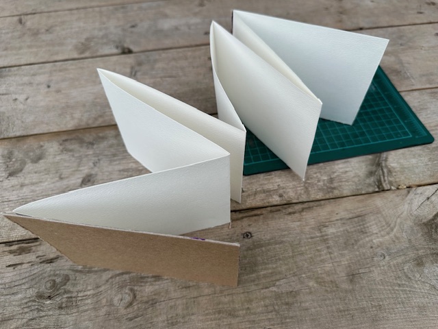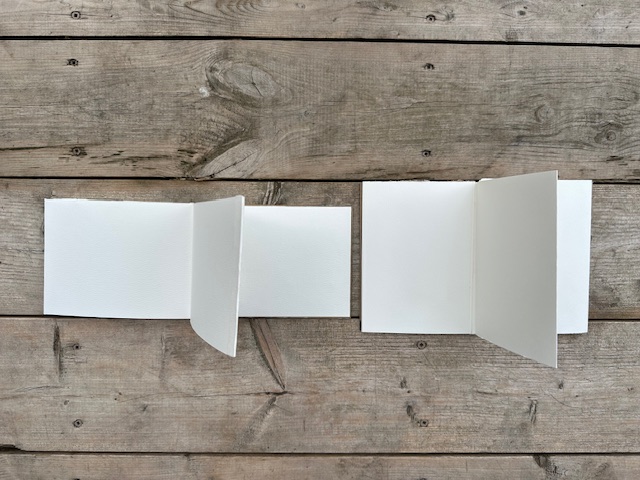 A portrait (vertical) orientation can be made by going back to the first step and folding & cutting the 2 sheets of paper horizontally from portrait orientation, for 4 strips of 6″ x 9″ (15.2cm x 22.9cm) paper. Then, follow the remaining steps.